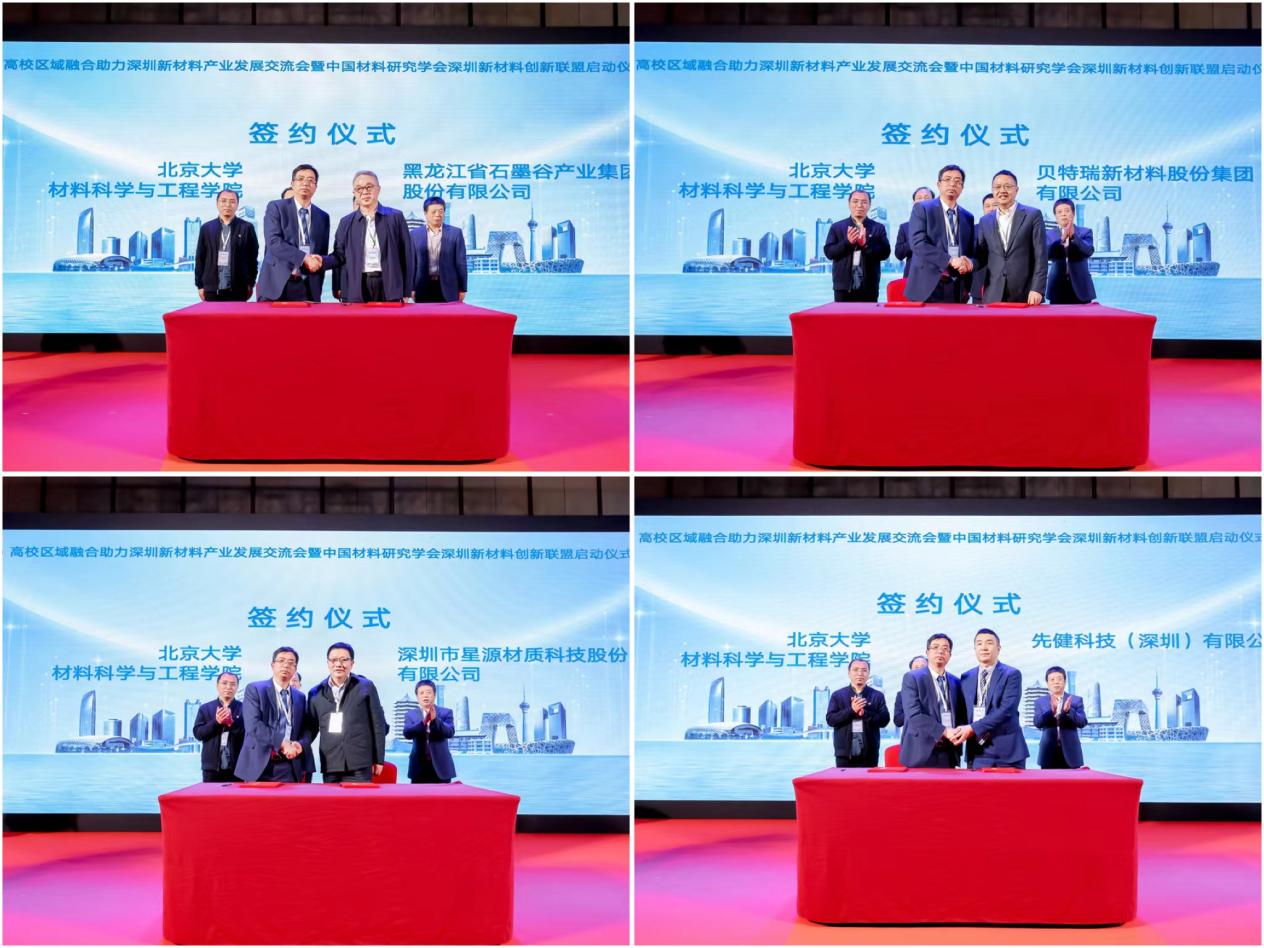 材料科学与工程学院与黑龙江省石墨谷产业集团股份有限公司、贝特瑞新材料股份集团有限公司、深圳市星源材质科技股份有限公司、先健科技(深圳)有限公司签署了合作备忘录。根据备忘录,校企双方将在人才培养、学科建设、科学研究等方面展开深入合作。