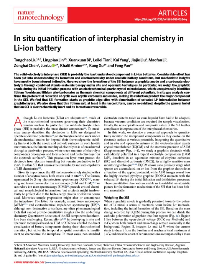 潘锋教授组发表在NATURE NANOTECHNOLOGY的论文“In situ quantification of interphasial chemistry in Li-ion battery”入选2019年“中国百篇最具影响国际学术论文”。该工作是将电化学方法与称量原子/分子重量石英微天平(EQCM)、观察原子尺度形貌的原子力显微镜(AFM)和监测极微量气体组成的微分质谱(DEMS)进行巧妙协同联用,在原子尺度原位实现不同电位下电极界面组分的定量监测,阐明锂电池负极界面重构稳定固态电解质界面(SEI膜)的机理,解决了长期困扰业界的难题,为锂电池及材料优化设计提供了的科学指导依据。