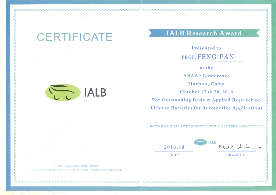 在创建学院时,就把新能源电动汽车动力电池与关键材料的科学研究与科技创新作为学院学科发展的重点。近三年来,学院在该领域取得了一系列国际有影响力的科学发现和技术创新成果,并承担了国家的多项重点研发项目, 如2013年作为科技协同创新中心与深圳企业共同承担了国家电动汽车动力电池的重大创新工程,2015年创建了“电动汽车动力电池与材料国际联合研究中心(国家级研究中心)”,2016年又承担了国家材料基因组工程重点专项(基于材料基因组技术的全固态锂电池及关键材料研发)等。鉴于团队在新能源电动汽车动力电池与材料方面取得的研发创新成绩,团队负责人潘锋教授获荣获2016年国际电动车锂电池协会(IALB)“杰出研究奖”,并在该协会举办的第九届国际电动车新型锂电池会议上(简称“ABAA9”,2016年10月,浙江湖州) 作了题为“锂离子电池扩散与热稳定性”的获奖特邀报告。报告介绍了团队近年来在锂电池的锂离子的扩散性能和电极材料的热稳定性等方面研究取得重要进展,从理论计算到实验测试等多维度剖析了影响锂离子扩散和电极材料的稳定性的机理。 本次大会一同获奖的还有英国剑桥大学Peter Bruce 教授(英国皇家科学院院士,新番