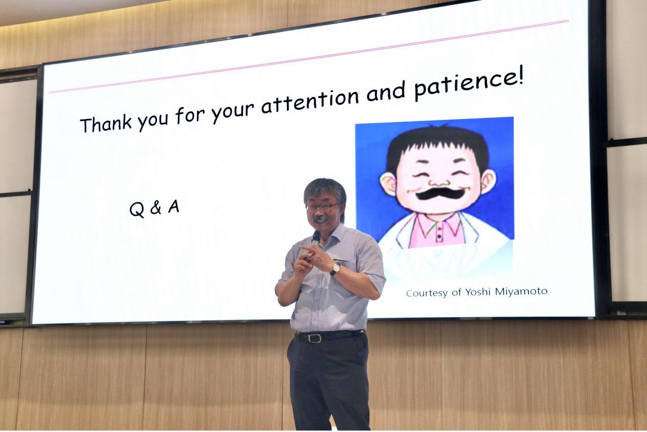 Young Hee Lee教授别出心裁地以一个萌趣十足的动画形象作为讲座收尾,这一新颖又活泼的形式赢得了在场师生的热烈掌声。在互动交流环节,现场师生围绕热载流子太阳能电池、更高效的钒掺杂工艺等热点问题踊跃提问,他均给予了耐心细致的解答。