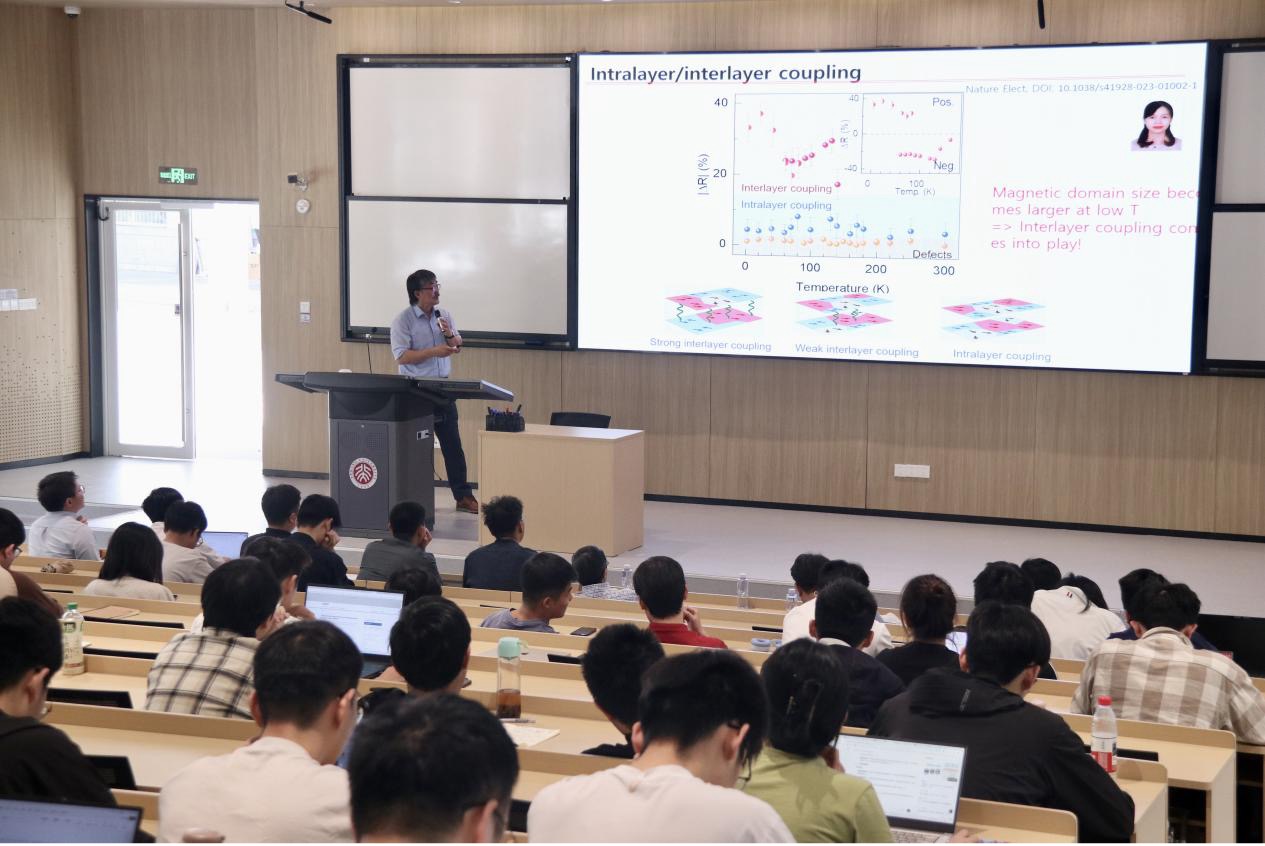 讲座伊始,Young Hee Lee教授介绍了二维单晶材料的晶圆级生长技术。晶圆级生长是实现半导体器件从实验室研究走向产业化应用的关键步骤。WSe₂属于二维范德华过渡金属二硫属化物(2D vdW TMD),其化学通式为MX₂,具有独特的层状结构。在WSe₂中掺入钒元素后形成的V-WSe₂材料,属于铁磁半导体材料(DMS)。这类材料的一大优势是在室温下就能表现出磁性,但目前仍面临一些挑战,例如钒原子在材料中分布不均匀、电子行为难以精确控制,以及材料在空气中容易氧化变质等问题。为了克服这些难题,研究人员正在尝试多种改进方法,如在材料层间插入其他原子、施加外力改变材料结构或将不同材料组合在一起等。这些改进措施有望显著提升材料性能,为未来开发新型磁控电子器件和存储设备奠定基础。