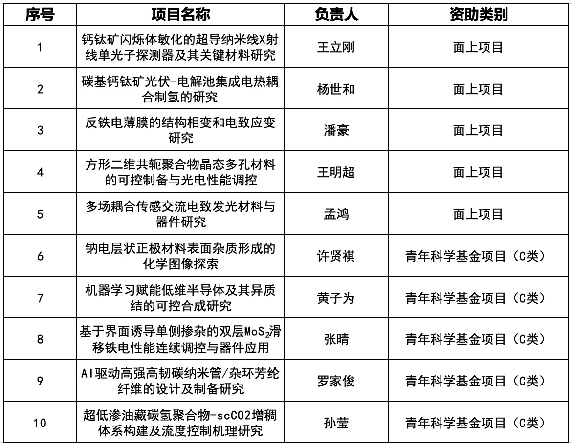 共获批10项,获批总经费达398万元,其中面上项目5项、青年科学基金项目(C类)5项,获批项目覆盖新能源材料、智能材料、光电信息材料、前沿功能材料和能源化工材料等多个前沿热点领域,体现了学院在学术研究领域的深厚积累和强劲竞争力。