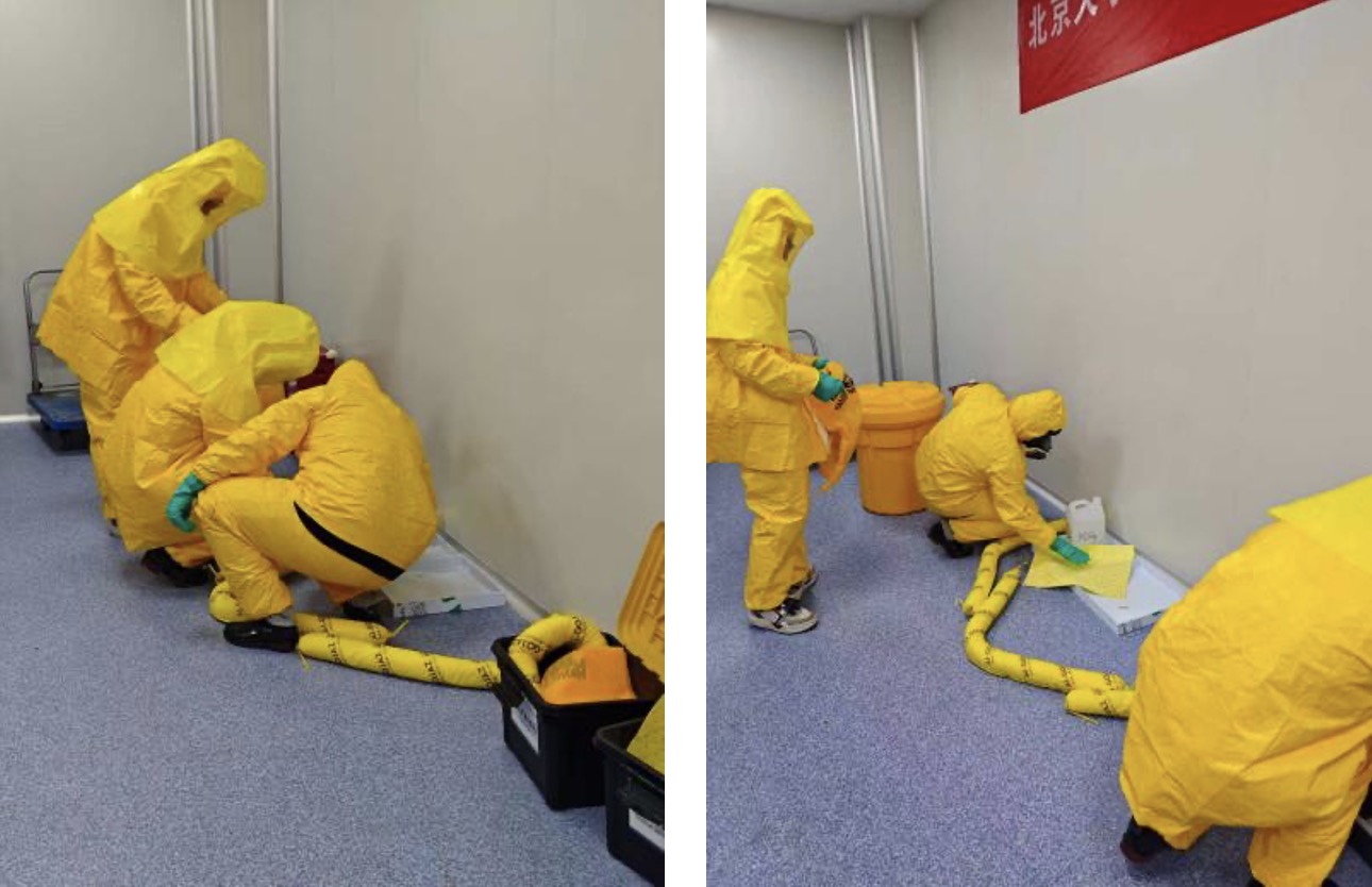 联合举办实验室酸碱化学品泄漏应急演练。