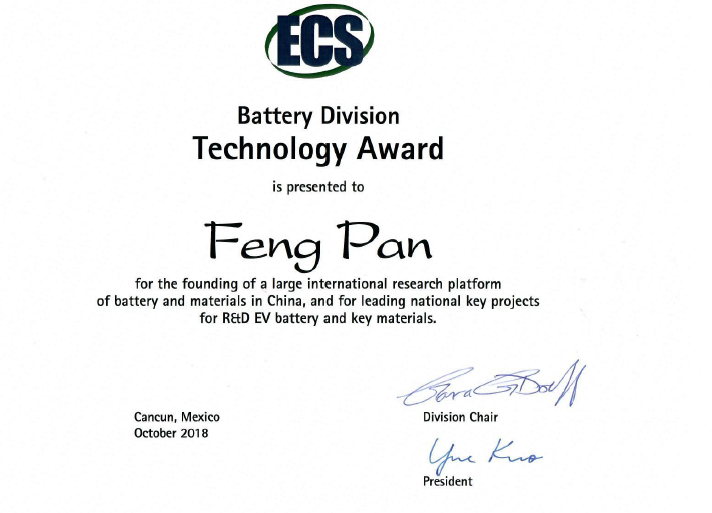 潘锋教授获2018年度美国电化学会(ECS)电池科技奖(Battery Technology Award),在日前由美国电化学学会、SMEQ、SBEE、SIBAE和ACEQ联合的举行的第234次美国电化学和固体科学国际会议(AiMES)( 墨西哥坎昆)会上,潘锋教授进行了题为《锂电池材料的晶体结构和界面结构与性能研究》的获奖报告,此次会议有来自世界各地相关研究领域约2000人出席。