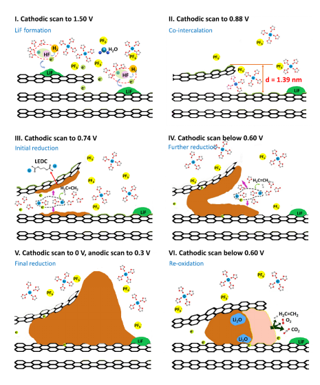结合电化学EQCM的定量、原位和现场特点以及AFM的原子精度形貌表征,团队在常规电解质(1.0 M LiPF6溶于EC和DMC)中研究了石墨电极的在首次脱嵌锂离子过程SEI膜的形成。作为一种高灵敏度的质量监测技术,EQCM可以精确地测量石墨电极上累积或损失的物质作为施加电位的函数,AFM图像可显示高度取向的热解石墨(HOPG)在初始锂化和脱锂过程中如何与溶剂化的锂离子相互作用。这些定量观察可用于建立迄今为止尚无法获得的SEI形成机制。团队发现SEI形成有五个不同的化学或电化学过程:第一阶段(图I),LiF在1.5V处在痕量水的电化学催化下形成;第二阶段(图II),在0.88V溶剂化的锂离子共嵌在石墨层间发生;第三阶段(图III),共嵌入的EC分子在0.74 V开始被还原生成初始的SEI膜;第四阶段(图VI-V),随着电位降低,EC分子持续还原形成SEI膜的有机组分;第五阶段(图VI),在锂离子脱出时SEI膜有机组分部分被氧化同时又无机Li2O组分留在层间。这些发现进一步加深了对SEI膜的理解,为设计更高性能的SEI膜提供了理论基础。