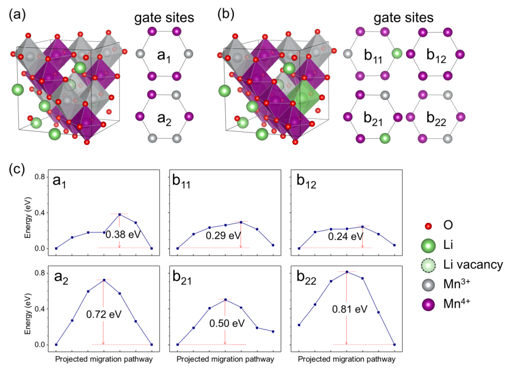 理论配比相超胞(a)和富锂相超胞(b)中Mn离子的价态分布以及超胞所包含的锂离子扩散通道对应的gate sites上的离子分布;(c)不同锂离子扩散通道的迁移能垒