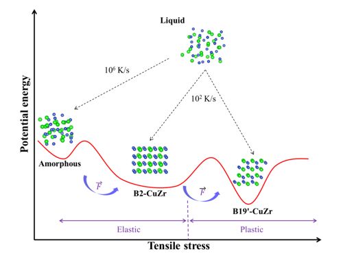 图2 CuZr在不同的冷速下分别获得B19'和B2相示意图。在慢的冷速下(~102 K/s)获得B19' 和 B2纳米晶相;在快的冷速下(~106 K/s)为单一的非晶相,但其在拉伸应力作用下只析出了B2相