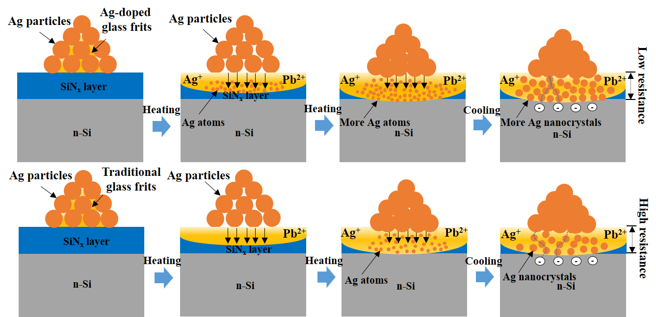 玻璃粉作为制备硅太阳能电池银浆材料的重要成分,在其中起着刻蚀减反层氮化硅的作用,玻璃粉的成分直接关系着电池性能的好坏,传统含铅玻璃粉在高温烧结过程中,首先氧化铅与氮化硅发生刻蚀反应,随着温度进一步升高,栅线中的银开始氧化溶解到玻璃熔体中进一步与氮化硅反应,反应还原出大量纳米颗粒在银/硅界面的玻璃层中。银纳米颗粒的密集程度直接影响着电池的性能。为了改善银/硅接触,使得在界面玻璃层中能够得到更加密集的银纳米颗粒,新型玻璃粉的开发显得尤为重要。近日,潘锋教授课题组在玻璃粉的研制方面取得了重要进展,开发取得了一种新型的掺银玻璃粉,形成了中国在这个领域的自主的知识产权。该玻璃粉与传统玻璃粉相比有着更加低的玻璃化转变点,有利于晶体硅电池的低温烧结。同时利用掺银玻璃粉,有着更加密集的银纳米颗粒在银/硅界面玻璃层中,使得电池的接触电阻大幅减小,效率进一步得到提升。相关研究成果近期发表在国际著名期刊Chemical Communications (Nature Index的杂志之一,影响因子IF=6.567) 发表(DOI: 10.1039/C7CC02838E),并申请了相关的发明专利。该工作由潘锋教授指导,14级硕士研究生袁升完成。
