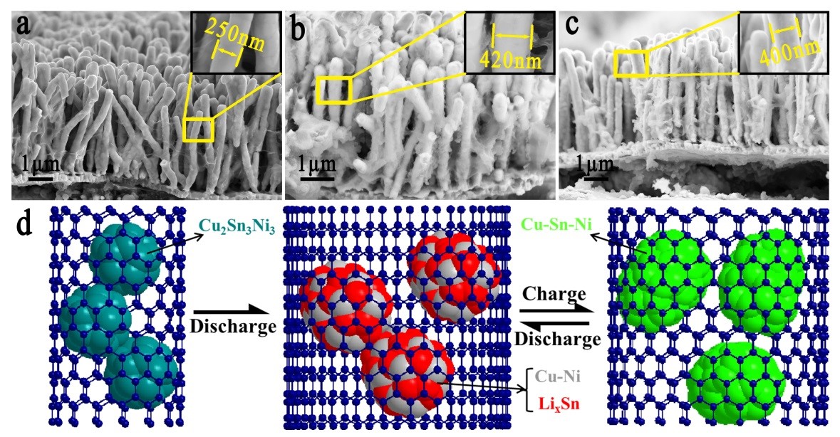 图2. 核壳结构Sn-Ni-Cu@C纳米棒阵列三维电极的界面图(a)初始状态,(b)10周循环后的满锂状态,(c)10周循环后的空锂状态;(d)循环过程中碳壳变化与合金相变化的示意图