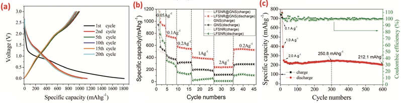 图2 (a) 在0.02 A g-1下,最初20次循环的充放电曲线。(b) 不同倍率下该材料的容量体现。(c) 在2A g-1下,该负极材料600次循环时容量体现。