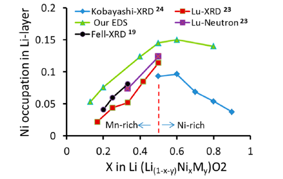 Figure Crystal models showing interlayer exchange of Li/Ni, Li/Co,and Li/Mn in the NCM424 cathode. ΔE indicates total energy increase due to Li/TM exchange. Comparison between our EDS measurement and previous XRD and neutron diffraction measurements on Li/Ni interlayer mixing levels as a function of Ni contents.