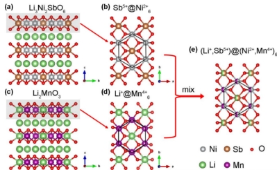 1. 由两种超结构基元(Li@Mn6与Sb@Ni6)复合得到的新型富锂正极材料Li(Li1/6Mn1/3Ni1/3Sb1/6)O2的设计示意图