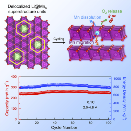 锂电池已经在手机、电动车和大规模储能广泛应用。商业化的锂离子电池正极材料主要是依赖于价格相对昂贵的钴(Co)和镍(Ni)元素的钴酸锂(LiCoO2)和高镍三元(NCM)正极。相比之下,层状富锰(Mn)正极材料由于Mn元素在资源和价格方面的巨大优势,具有较大的发展潜力和研究价值。然而,当前发展的富锰正极材料虽然具有氧(O)变价带来的更高能量密度,但也面临着循环过程中由晶格氧(O)的流失、不可逆结构相变和Mn元素迁移和溶出等导致的层结构破坏,从而造成持续的容量和电压衰减问题。因此,如何实现晶格氧和层结构等的稳定,一直是层状富锰正极材料的重要研究方向。