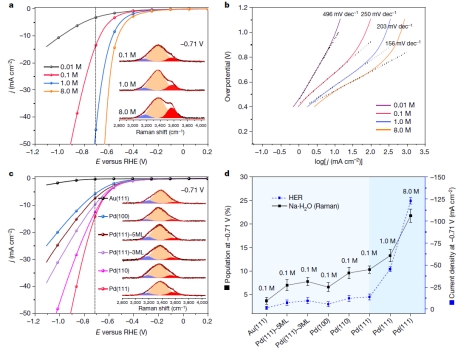 团队融合增强拉曼原位监测钯单晶电极/溶液界面水分子的构型及其动态变化过程等实验与量子化学计算,发现电极/溶液界面除了已知的含有氢键网络连接水分子之外,还有一类与阳离子键合的水分子,该水合阳离子能与钯单晶负电极形成有效地静电相互作用下,在负电极电势逐渐降低时键合在阳离子上的水分子在钯单晶负电极界面排布成有序的结构。通过第一性原理分子动力学模拟进一步从理论上证实从原子尺度描述了界面水从无序到一个氢朝下再到两个氢朝下的相对有序构型的转化过程。重要的是,这类有序的界面水分子比氢键网络连接的水分子更加靠近电极表面,可以有效地实现氢与电极表面间的电荷转移,从而极大提升产氢效率。以此机理,进一步发现了提高阳离子的浓度和价态能够提升水合阳离子与负电极静电相互作用,会进一步增加界面区有序水分子的含量从而提高产氢效率。此外,研究还发现单晶电极的晶面结构和电子结构都将影响阳离子键合水分子的含量和产氢效率,证实了阳离子键合水分子对产氢效率具有普适性。