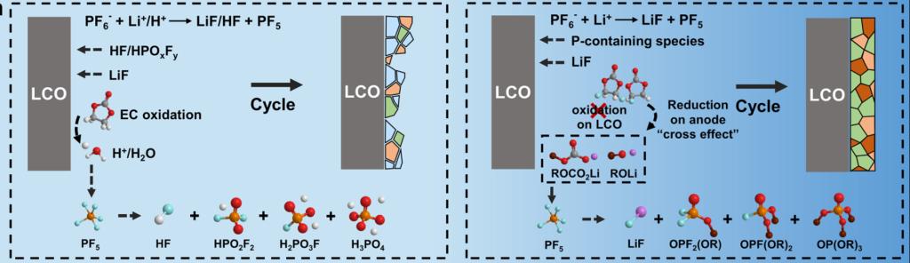 长期以来,钴酸锂(LiCoO2,LCO)一直是消费电子领域不可或缺的正极材料。通过提升钴酸锂电池的充电截止电压能够提升其放电比容量,在4.5-4.6 V(vsLi/Li+)的工作电压下,其放电比容量能够达到190-230 mAh g-1,能够极大拓宽其实际应用场景。然而,高工作电压下钴酸锂表面存在高氧化活性的Co4+/On-(0<n<2),目前商用的基于碳酸乙烯酯(EC)体系的电解液在4.3 V及以上电压会发生严重的氧化分解。同时,EC的氧化分解产物H+/H2O会促进LiPF6的水解过程,产生大量HF、HPO2F2等腐蚀性物质攻击材料表面,加速LCO表面的Co溶出及O流失,并恶化正极/电解液界面相(CEI)的性质,显著阻碍锂离子在钴酸锂界面以及表面结构中的快速脱嵌,破坏了体相相变的可逆性,并导致裂纹的形成以及电池整体性能的衰减。因此,提高高电压电解液的抗氧化性能,去除HF等腐蚀性物质,并形成保护性的CEI结构以减少不良的界面反应,是从电解液调控角度稳定高电压钴酸锂结构的关键。
