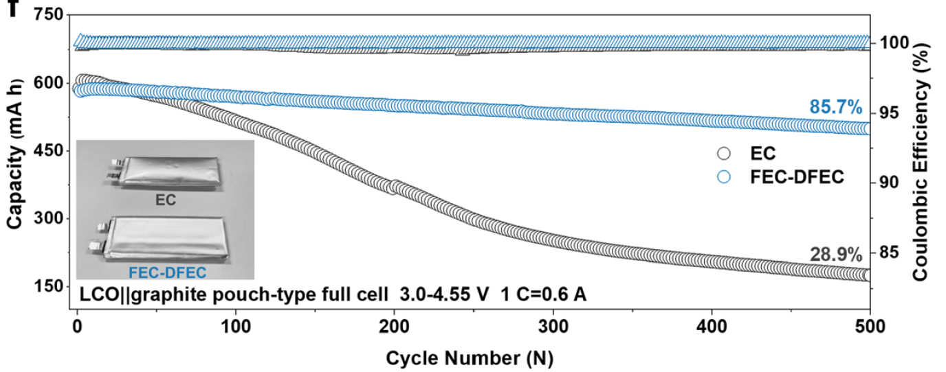 图2. FEC-DFEC基电解液的钴酸锂界面相稳定的机理和软包全电池电化学性能