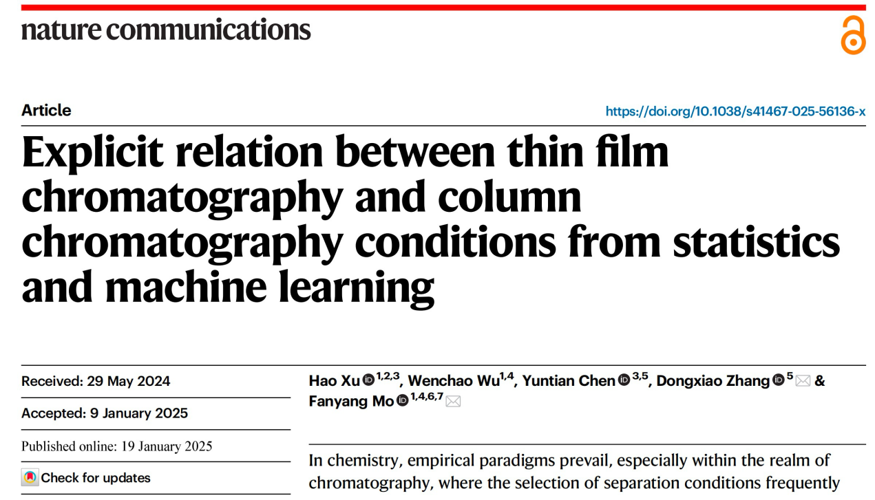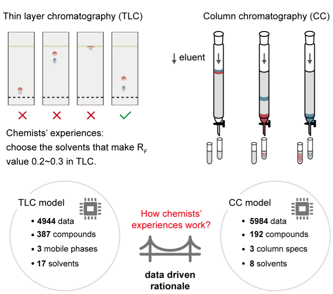 近日,我院莫凡洋团队与东方理工大学张东晓团队合作,通过结合统计学和机器学习方法,首次明确揭示了薄层色谱(TLC)与柱色谱(CC)之间的量化关系。该研究提出了一种知识发现技术、建立了可解释的公式,将专家经验(Chemist’s experience)转化为“人工智能经验”(AI experience),为色谱分离实验条件的确定与优化提供了理论支持。相关成果发表于《自然·通讯》(Nature Communications)。