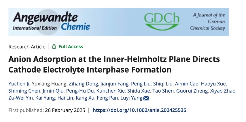 该研究成果不仅深化了学术界对 CEI 形成机制的理论认知,也为未来高性能锂离子电池电解液体系设计及电极/电解液界面优化提供了重要的理论指导。相关研究成果以“Anion Adsorption at the Inner-Helmholtz Plane Directs Cathode Electrolyte Interphase Formation”为题,发表于化学领域国际知名期刊《Angewandte Chemie International Edition》(德国应用化学)(DOI: 10.1002/anie.202425535)。