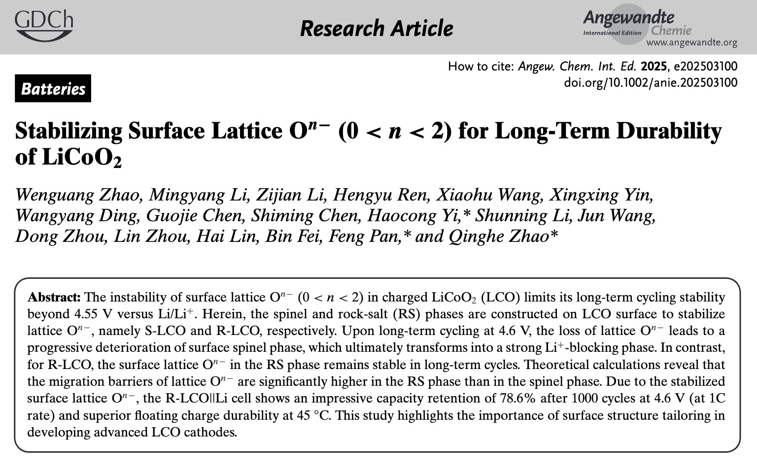 潘锋/赵庆贺团队取得重要研究进展,通过调控表面Li+含量,在LCO表面构建尖晶石相(S-LCO)和岩盐相(R-LCO),结合循环后表面相表征、价态分析与氧空位形成/迁移的理论计算,阐明了两种表面相对晶格On-稳定性的差异。研究发现,在4.6 V下长期循环过程中,LCO表面的尖晶石相因晶格氧损失逐渐退化,最终转变为较厚的Li⁺阻挡相结构;而R-LCO表面岩盐相中的晶格氧在循环中保持长效稳定,保障了表面Li+的稳定脱嵌。理论计算表明,岩盐相中晶格氧的迁移势垒显著高于尖晶石相。得益于表面晶格氧的稳定化,R-LCO||Li电池在4.6 V电压下以1 C电流循环1000次后容量保持率高达78.6%,并在45℃浮充测试中表现出优异的耐久性。该研究揭示了表面结构调控对提升LCO正极性能的重要性,为开发先进高压LCO正极提供了新思路。相关研究成果以“Stabilizing Surface Lattice On- (0<n<2) for Long-Term Durability of LiCoO2”为题,发表于国际顶级期刊《德国应用化学》(Angewandte Chemie International Edition,影响因子16.8)。