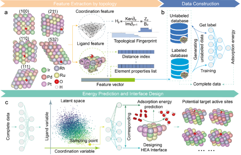 GLMY同调(persistent GLMY homology, PGH)由国际著名数学家丘成桐先生团队提出,是一种能够处理非对称、有向图结构的代数拓扑方法,特别适用于复杂结构体系的几何—拓扑建模。复杂的催化活性位点逆向设计框架是基于图论结构化学对原子级结构的抽象建模,以持续GLMY同调为核心拓扑工具,从几何结构中提取拓扑不变量,能够刻画活性位点的三维连通性与空穴等关键结构信息。研究团队以IrPdPtRhRu高熵合金为研究对象,创新性开发了融合PGH拓扑指纹与元素配体信息的双通道结构表征方法,分别编码原子配位与远场调控效应,结合变分自编码器(VAE)构建了结构—性能关联生成模型。在训练数据有限(仅约1100条DFT样本)的条件下,通过引入半监督学习机制和梯度提升回归器(GBRT),模型对*OH吸附能的预测平均绝对误差达到0.045 eV,展现出极高的预测精度。