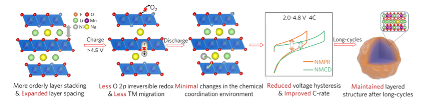 图1. Na⁺/F⁻掺杂在提升动力学和维持长循环结构稳定性的作用示意图