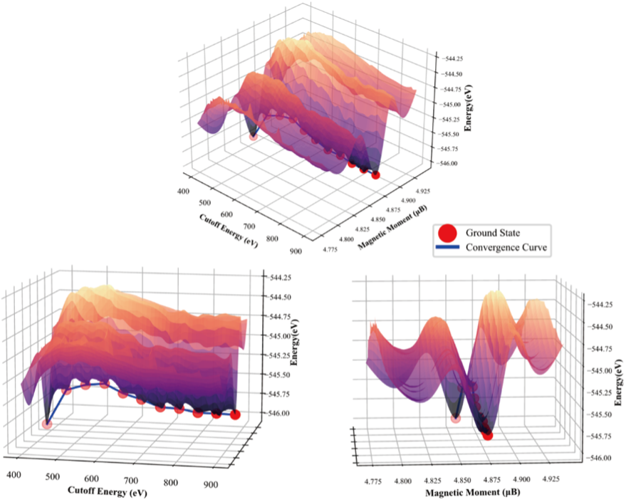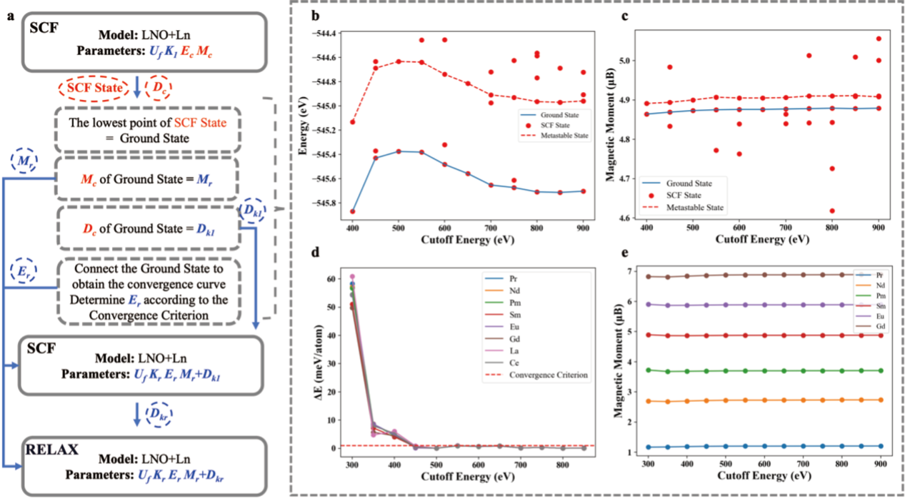 针对这一稀土元素特有的理论计算难题,郑家新团队创新性提出一种基态搜索方法:通过在计算流程中调整初始磁性收敛控制参数,在DFT+U方法下进行低成本、遍历式的自洽场(SCF)运算搜索。研究发现,收敛态能量与4f电子磁矩值存在明确对应关系,因此可通过磁矩值精准识别电子结构基态。该方法相较常规计算具有三大优势:1)显著降低算力消耗;2)大幅提升计算稳定性与效率;3)确保结果高精度。图2展示了该方法的计算流程和测试表现。