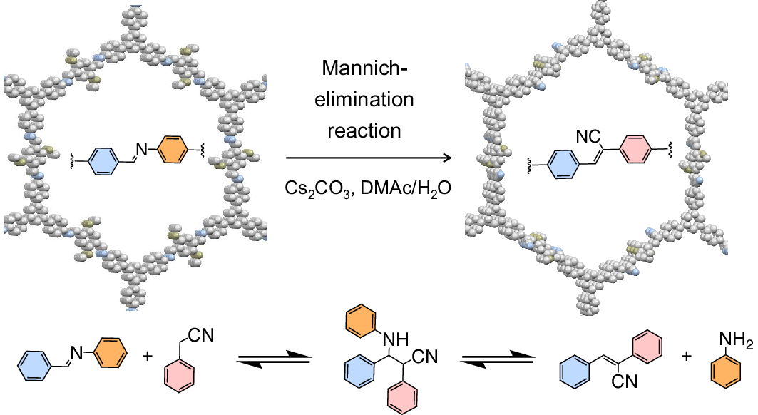 化学与分子工程学院等合作团队,创新性地提出Mannich–消除反应策略,通过可逆的C=C键形成机制,成功将8种二维聚亚胺转化为11种高结晶度二维聚(亚芳基亚乙烯),实现了对材料结晶行为的精准调控。