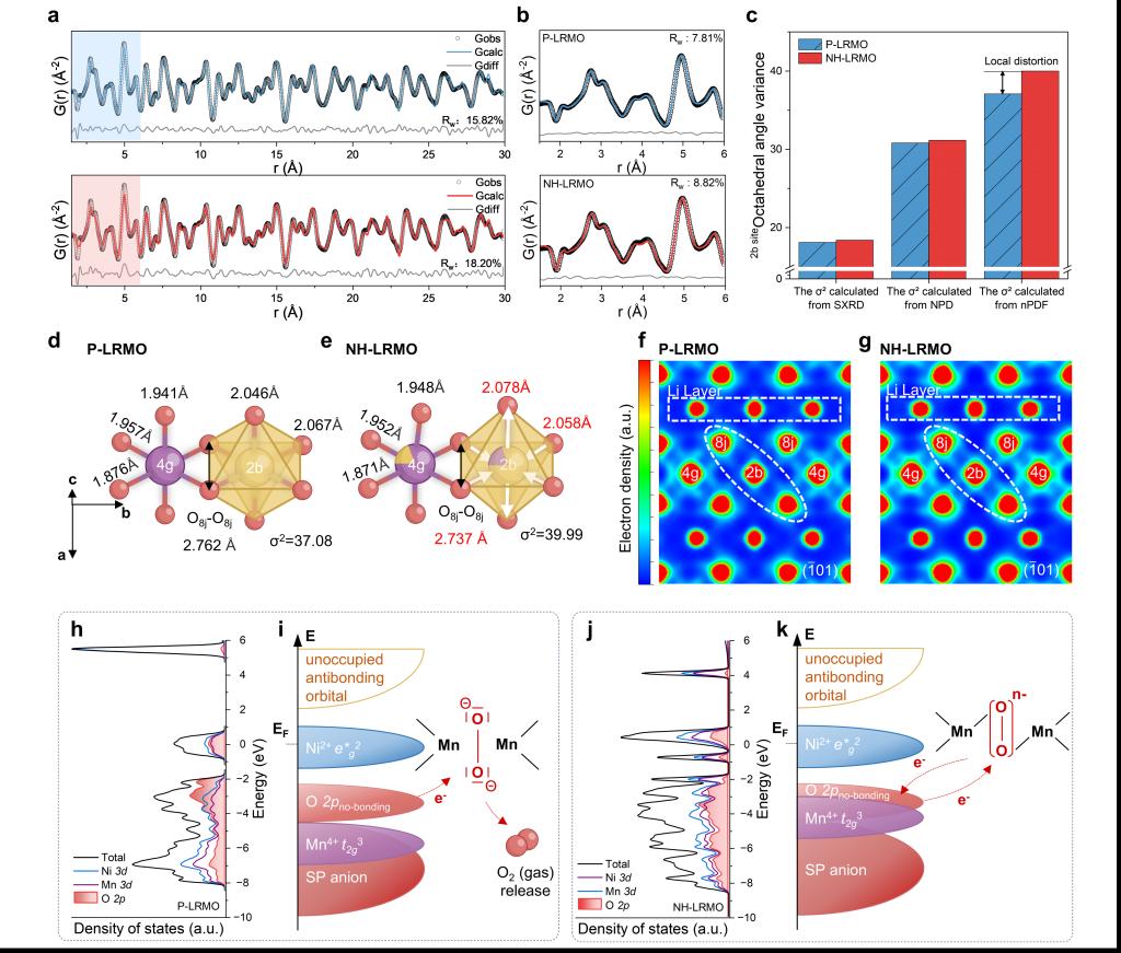 为深入揭示调控机制,团队综合采用同步辐射 X 射线衍射、中子全散射、最大熵方法、原位电化学质谱、同步辐射软/硬 X 射线吸收光谱等多种先进表征技术,并结合第一性原理密度泛函理论计算,从原子尺度建立了局域结构畸变与电子结构演化的直接关联,证实了体相八面体畸变对 Mn-O 共价键合的增强机制,以及表面质子化对晶格氧解离的抑制作用。同时,团队利用氘代高分辨中子衍射成功实现了 Li+/H+ 交换行为的定量表征,为界面质子化调控提供了直接的实验证据。