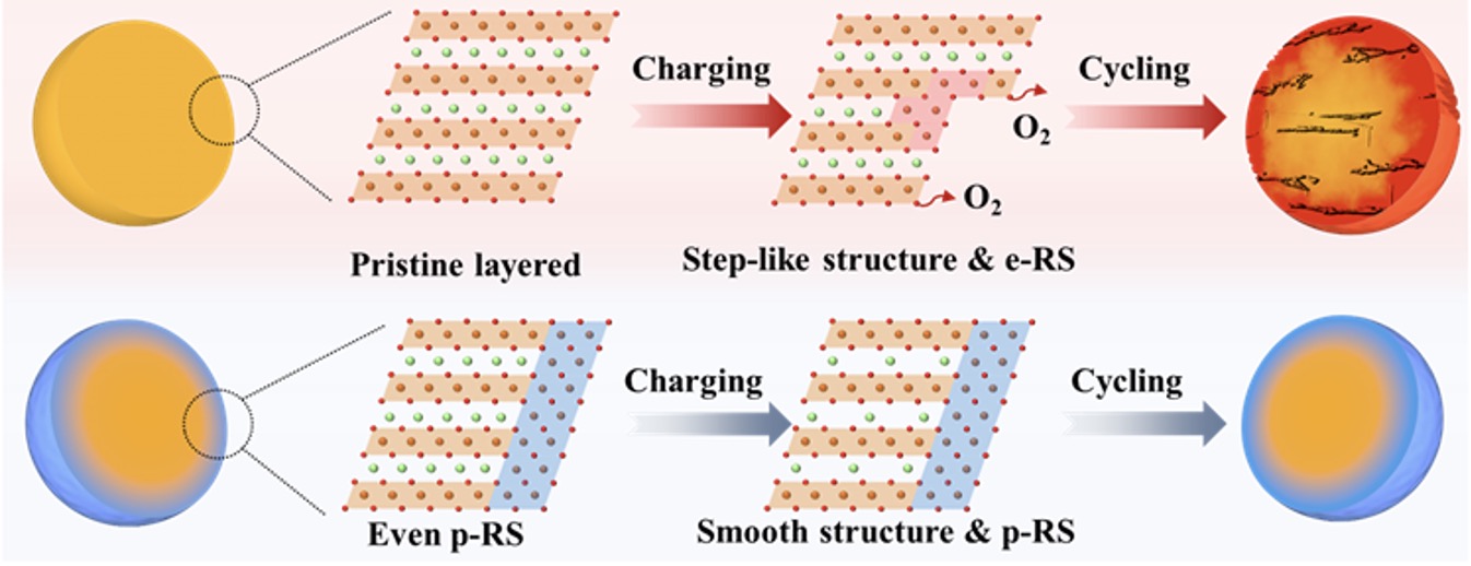 钴酸锂(LiCoO₂,LCO)因具有较高的体积能量密度,长期以来被广泛应用于消费电子产品的锂离子电池中。为进一步提升电池能量密度,提高充电截止电压成为释放LCO容量的重要途径。然而,当工作电压提升至4.5 V以上时,深度脱锂状态下的LCO容易发生表面晶格氧流失、近表面结构重构以及界面副反应加剧等问题,导致循环稳定性显著下降。因此,揭示高电压条件下LCO表面结构退化的起始机制,并据此发展有效的表面调控策略,是提升其高电压循环稳定性、延长循环寿命的关键所在。