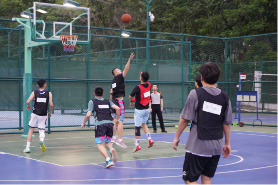 紧接着是毕业班对抗非毕业班师生全场赛。毕业生和非毕业生首先分别派出了5位首发选手,双方比分一直不相上下,在比赛中都有出色的发挥。比赛过程中,双方各自都有选手投出了优秀的配合球,以及多个三分球,将赛场的氛围提升至火热的状态。中途在交换选手环节,各队替补选手分别上场替换首发队员,每一位选手都上场大显身手,为比赛做出自己的贡献。在最后一场比赛中,选手们都发挥了自己的全力,在相互配合和友好互助的氛围中毕业生团队夺得了最后的胜利,所有参赛选手都展现出了卓越的团队合作精神。