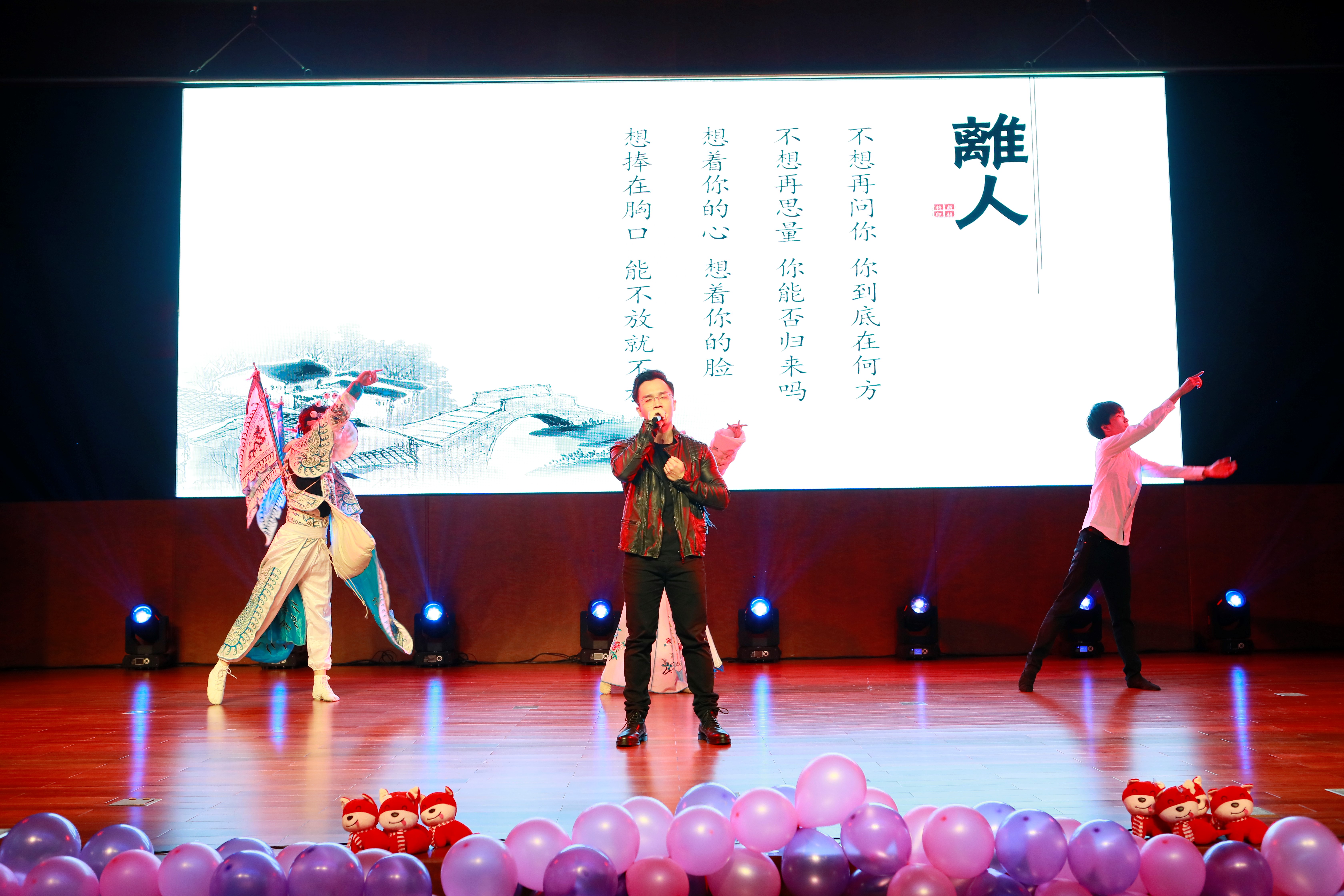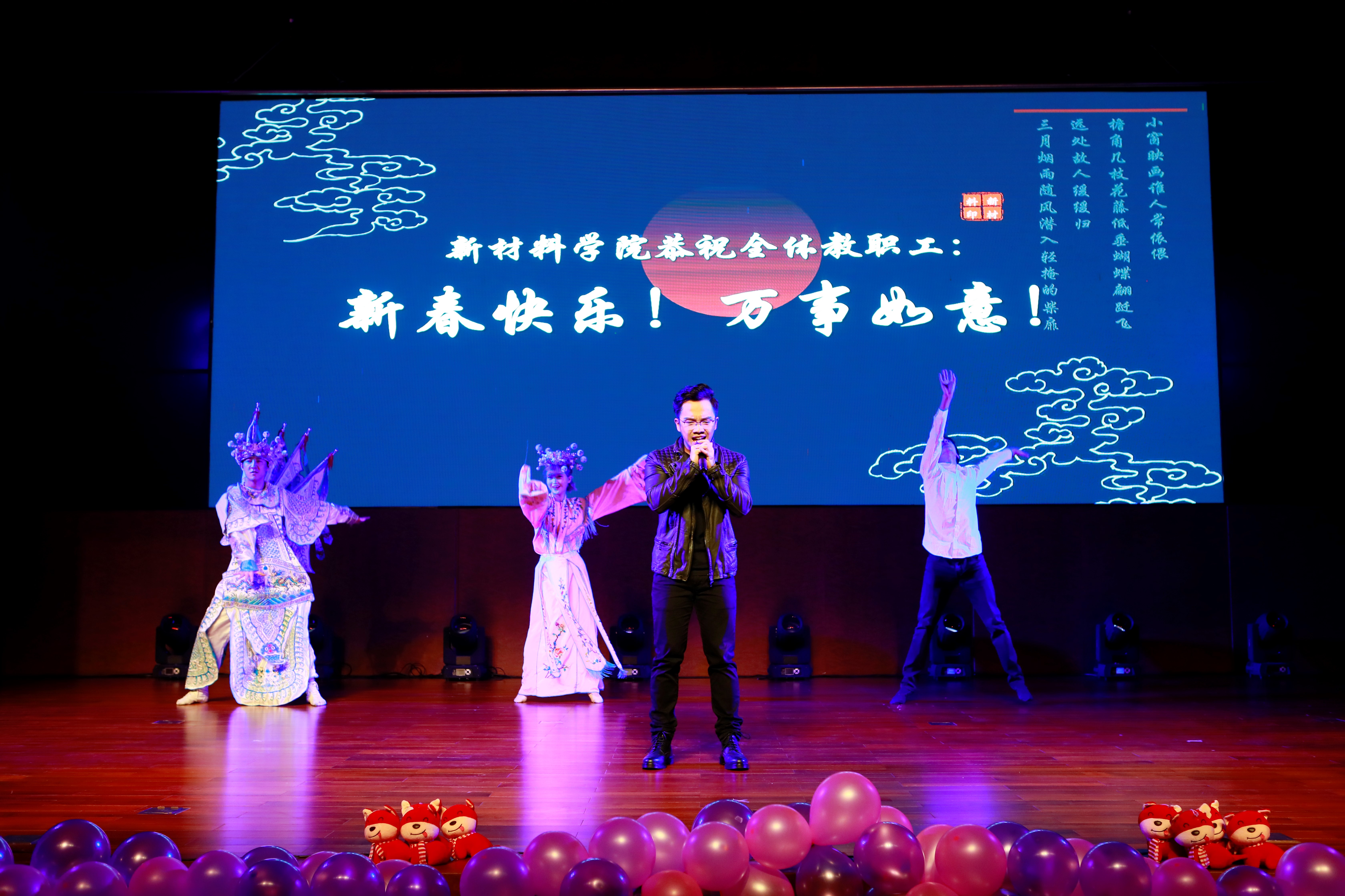此次选派了教职工代表杨卢奕等合力呈现的歌舞《One night in Beijing》,歌曲融合了摇滚及京剧两种元素,时而高亢磅礴时而婉转细腻,现代摇滚及国粹唱腔在不同的时空维度交织碰撞。“我已等待了千年,为何城门还不开。我已等待了千年,为何良人不回来。”舞蹈部分也是刚柔相济、幽咽婉转,三位演员分别用戏曲风及现代舞两种形式演绎了一场跨越千年的绝世爱恋。精彩绝伦的表演引爆了团拜会现场,充分展现了新材料人的活力与青春。