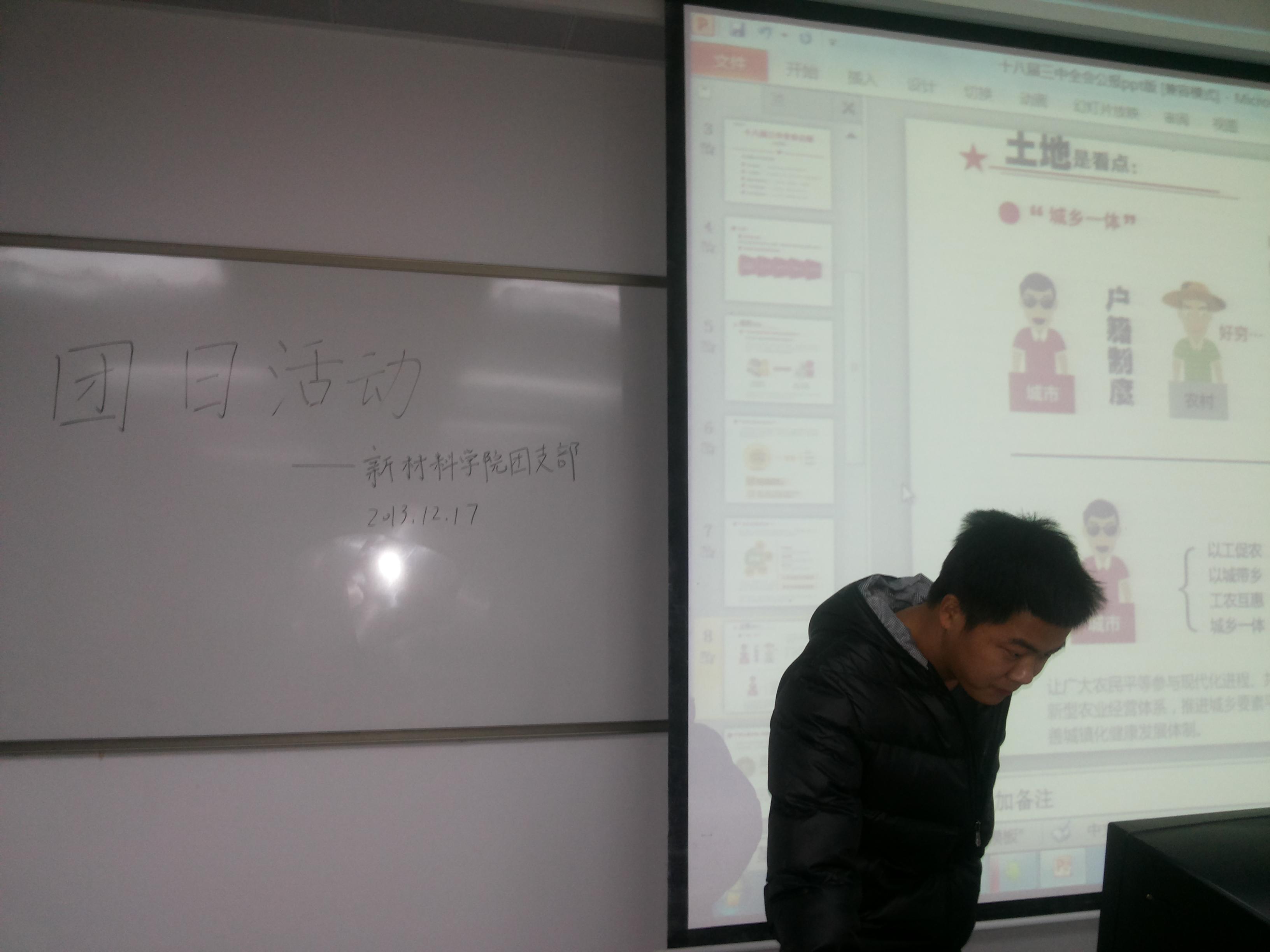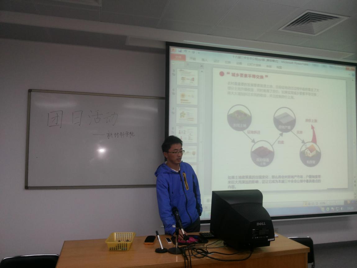 团支部学生书记胡博洋同学向大家解读了十八届三中全会的历史由来,并向大家科普了什么是“三中全会”,多久召开一次以及“三中全会”重点关注的问题。组织部部长林钦贤同学则为大家准备了同学们最关心的“三中全会”中关于户籍制度的问题,并向大家传达了“决定”中的改革精神。宣传部长王凯同学接着户籍制度的问题,重点讲解了关于土地的改革,并说道农村最重要的发展要素就是土地。