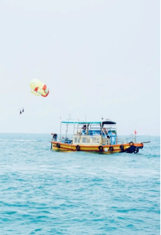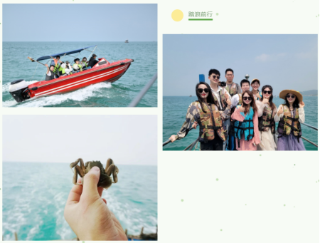 第二站【观海致远】,海风吹我衣,渔船摇不已。 海湾渔民领我行,同学共乘踏浪声。 捕鱼为乐增实力,协作为怀展志气。