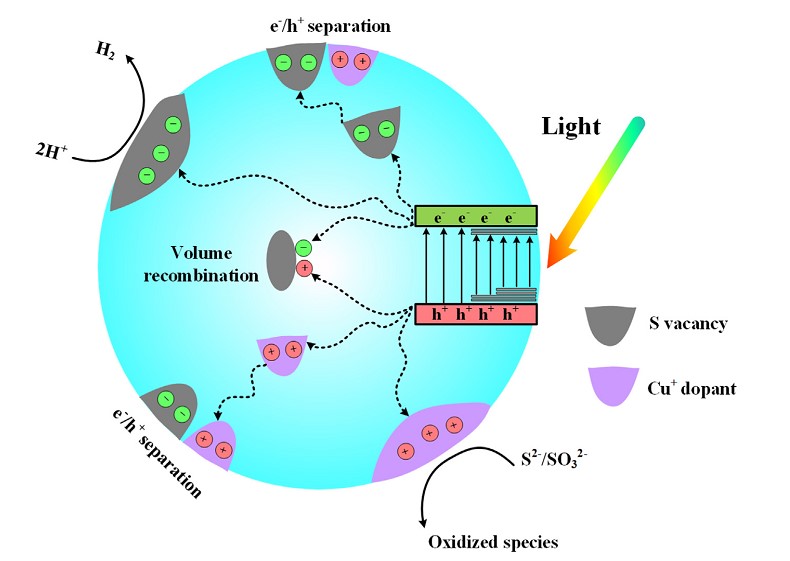 在北大新番 潘锋教授的指导下,博士后梅宗维和张炳凯与团队老师和研究生合作,通过实验及理论计算相结合的方法发现Cu2+掺杂Zn0 5Cd0 5S后自发变为Cu+,并促使S缺陷的生成。