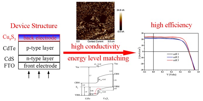 在潘锋教授指导下,博士后张明建和研究生林钦贤等人和团队的老师同学合作,发现了新型p型Cu9S5化合物具有良好的导电性,并将之制备成纳米薄膜,用作CdTe电池的背电极,实现了转换效率的