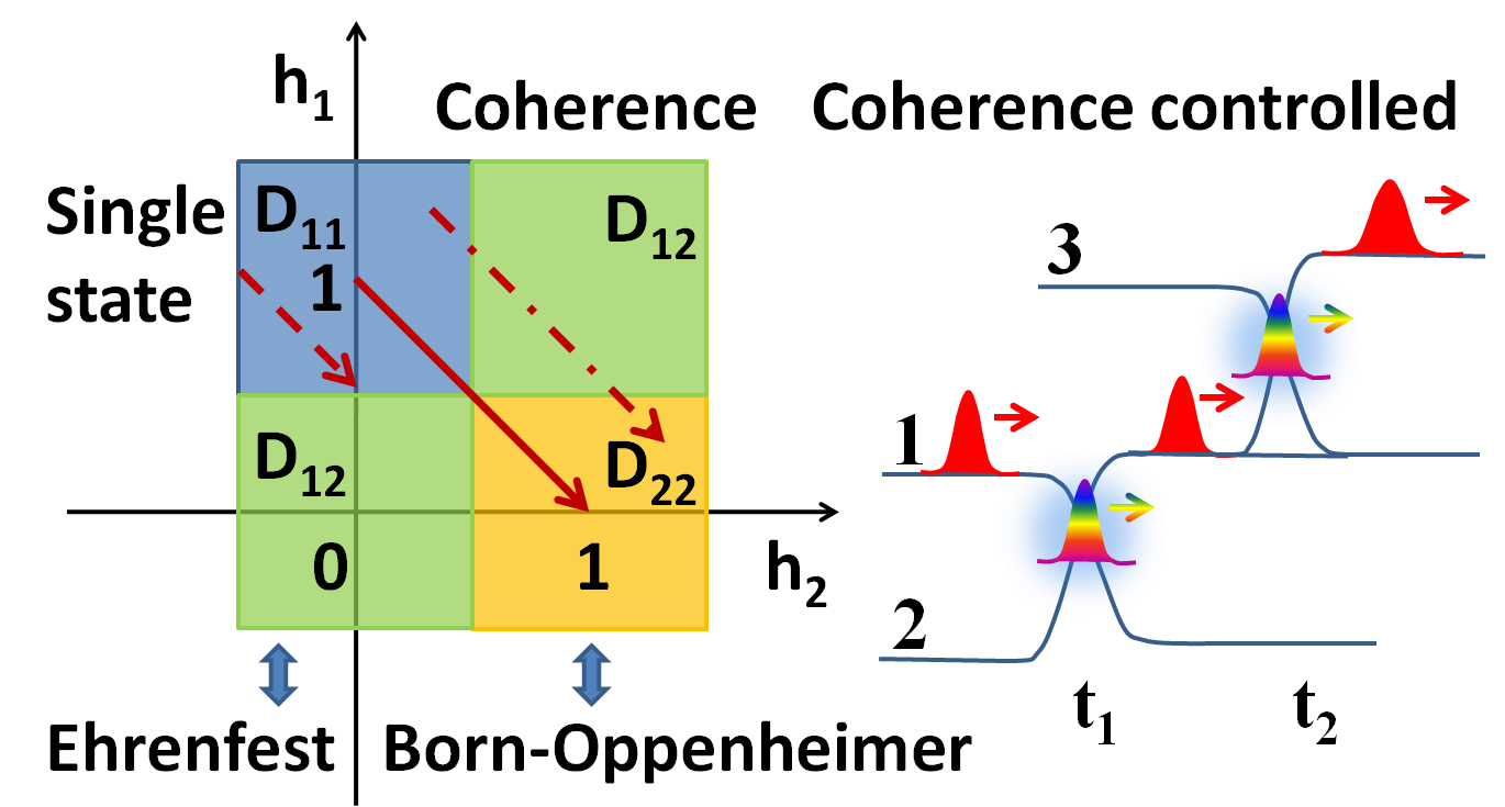 在前期工作的基础上, 新番 陶国华副教授近期开发了一种非绝热动力学新方法-相干控制方法[coherence-controlled]。该方法基于经典电子态空间和全电子矩阵之间的映射以及分解态空间和不同