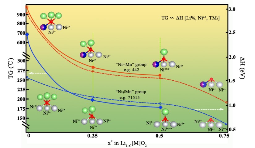 潘锋教授团队通过第一性原理计算和实验验证,发现三元层状正极材料的稳定性与晶格结构中最不稳定的氧有关,而氧的稳定性又由其基本的配位单元决定(TM(Ni, Mn, Co)3-O-Li3-x’: 每个氧和过渡
