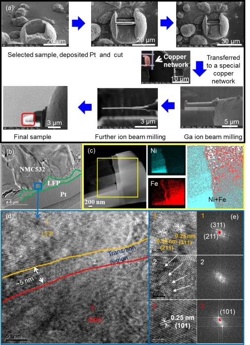 在潘锋教授的指导下,吴忠振特聘研究员和季顺平工程师等人在前期研究的基础上,采用简单的球磨旋转的方法,将(010)晶面的nano-LFP包覆于三元材料(NMC532)表面,为NMC材料制备了高强度了