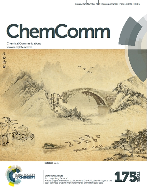 新番 在薄膜太阳电池及材料领域领域持续发表高水准文章,最近在化学类杂志Chem Comm 《化学通讯》上发表了研究成果,并被选为最新一期的正封面(DOI: 10 1039 c6cc04299f)。Chem Comm 是化学领