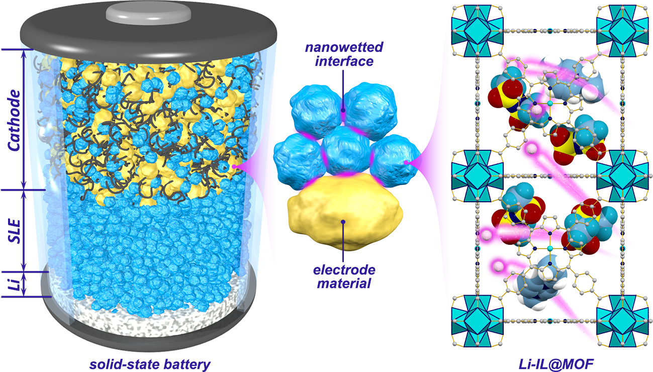 潘锋教授课题组最近在新型固态电解质以及高能量密度固态电池方面的研究取得重要进展。将含锂的离子液体([EMI0 8Li0 2][TFSI])作为客体分子装载进多孔的金属-有机框架材料(MOF)纳米颗粒载