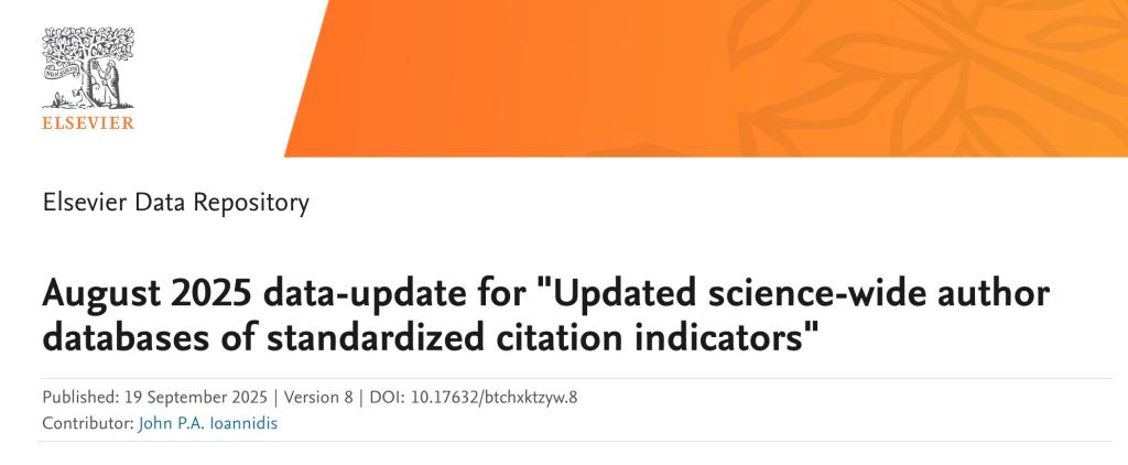 9月19日,由斯坦福大学John P. A. Ioannidis教授团队发布的全球前2%顶尖科学家榜单更新了2025年版本,这也是该团队公布的第八版本。该团队基于Scopus数据库,提供总引用量、h-index、共同作者修正的hm-index、不同作者位置的引用及综合指标(c-score)等标准化信息。考虑到不同研究领域的差异,该榜单将科学家划分为22个领域和174个细分子领域,力求为科学家长期科研表现提供一个衡量指标,以期能够更客观、更真实地反映科学家的...
